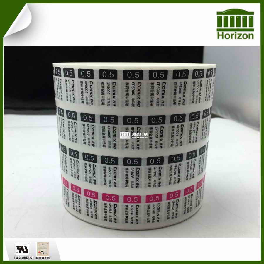 中性笔标贴:可用于化工类等产品的非直接接触标签用途,广泛适用于精细、高光泽彩色标签印刷。适用于药品、食品、化工产品等行业较苛刻的印刷、热烫金、喷码等加工应用;可适用于玻璃、钢板、纸箱、PE、PP、PET、等基材的贴标并有很好的粘附效果。